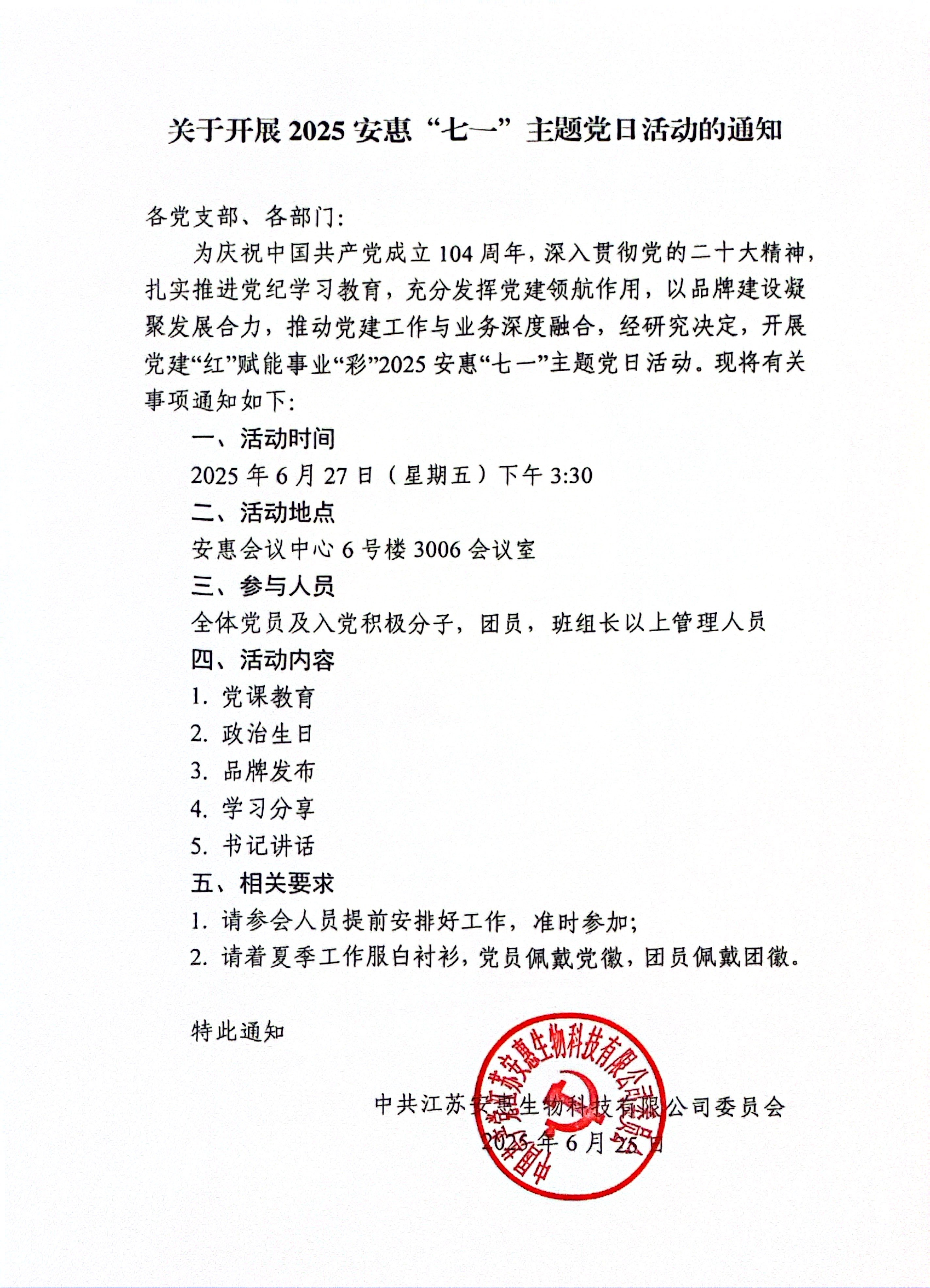 关于开展2025安惠“七一”主题党日活动的通知
