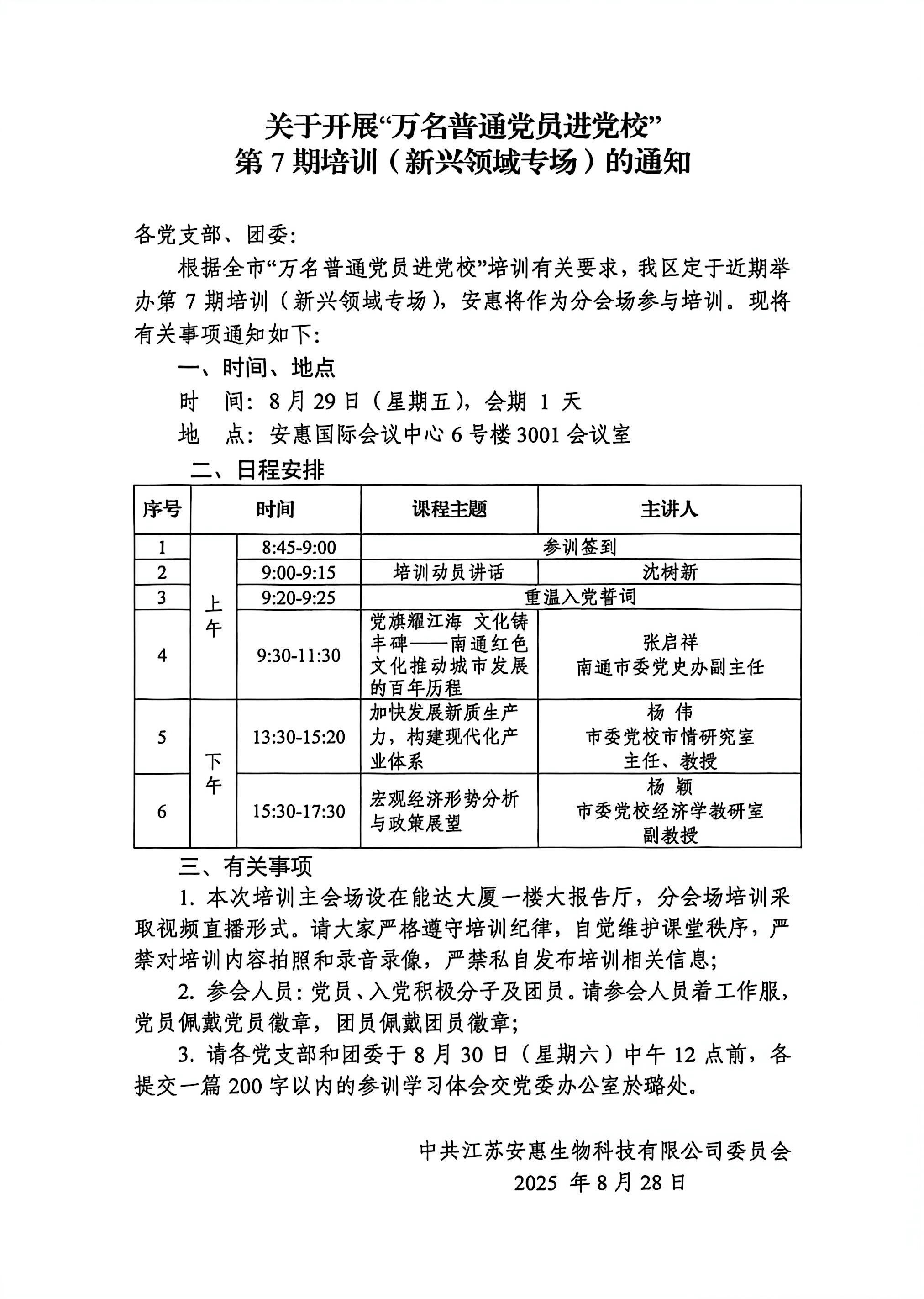 关于开展“万名普通党员进党校” 第7期培训(新兴领域专场)的通知