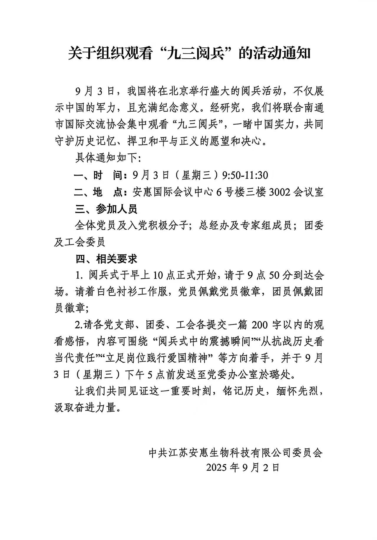 关于组织观看“九三阅兵”的活动通知