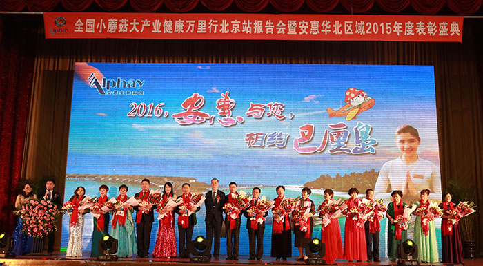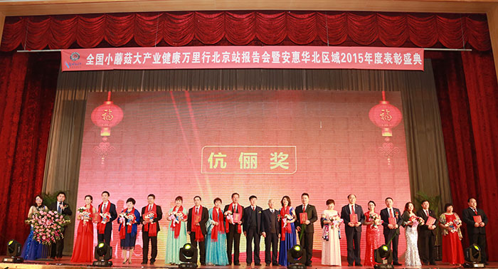 3月12日,2016全国“小蘑菇 大产业”健康万里行北京站报告会举行。中国食用菌协会秘书长何海龙、安惠公司董事长陈惠、副总经理施宏昌、总经理助理陈杰和华北区域的1500多位安惠优秀经销商代表出席活动。